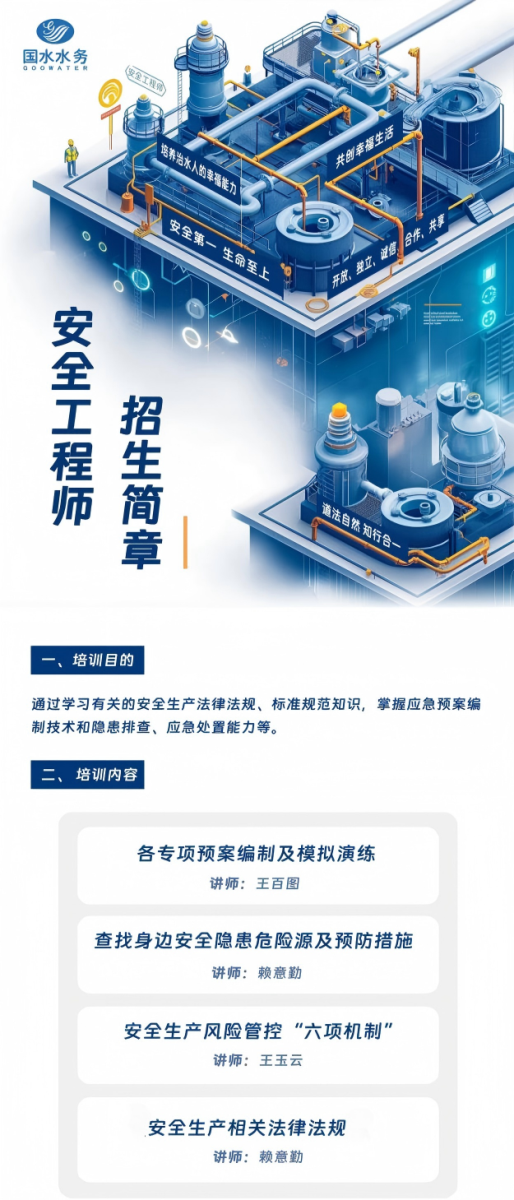 “安全是底線,人才是防線?!?/strong>近日,國水水務“安全工程師崗位培訓+內部安全攻堅活動”雙軌行動正式啟動。這不僅是公司深化“學安全、強技能、固防線”內部建設的關鍵舉措,更標志著國水水務將“自我安全賦能” 的實戰(zhàn)經驗,轉化為面向涉水企事業(yè)單位的 “安全人才培育+安全體系搭建” 培訓產品正式成型?—— 既實現(xiàn)自身安全人才專業(yè)化、內部安全管理標準化,更能為客戶提供 “可復制、可落地” 的安全培訓和安全生產服務,真正做到“先筑牢自家籬笆,再為客戶遮風擋雨”。